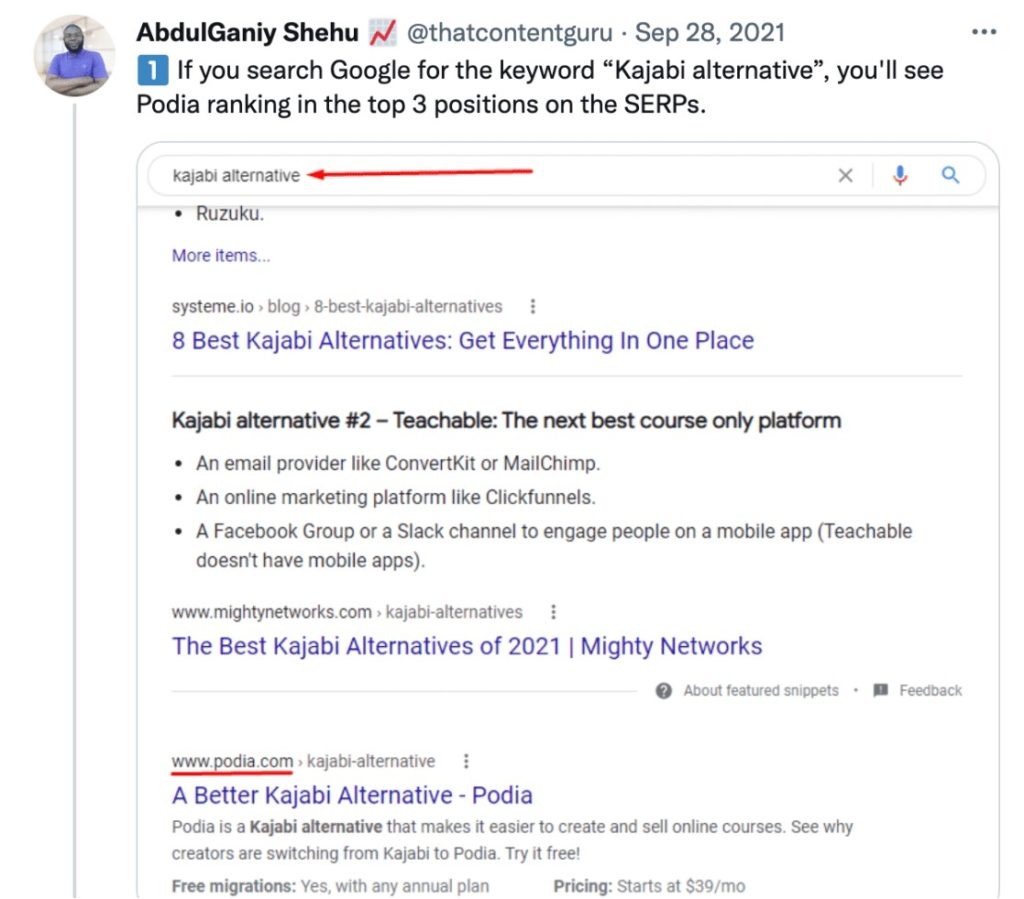 Alternatively, like Podia, you can use reviews as a strategy to grab your competitors’ prospects from under their nose.